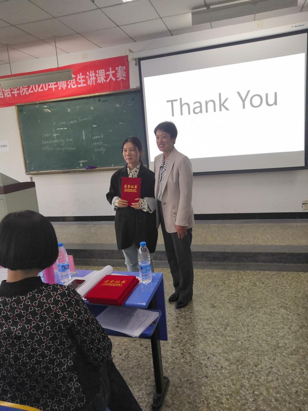 本次大赛要求参赛者从中学英语课程中选择相关内容进行教学,大赛项目包括教学设计、即席演讲、模拟授课·板书、现场问答等。比赛过程中,选手们的教学设计独具匠心,模拟授课精彩纷呈。比赛结果刘冰洁同学夺得一等奖,范瑞蒙、李爽同学获得二等奖,另有五名同学获得三等奖。最后,校教学督导组成员,孙素萍副教授做了精彩的点评,希望同学们以此次大赛为契机,努力学习,争做“师德高尚、理念先进、能力突出、锐意创新”优秀师范生,为将来走上工作岗位打下良好基础。