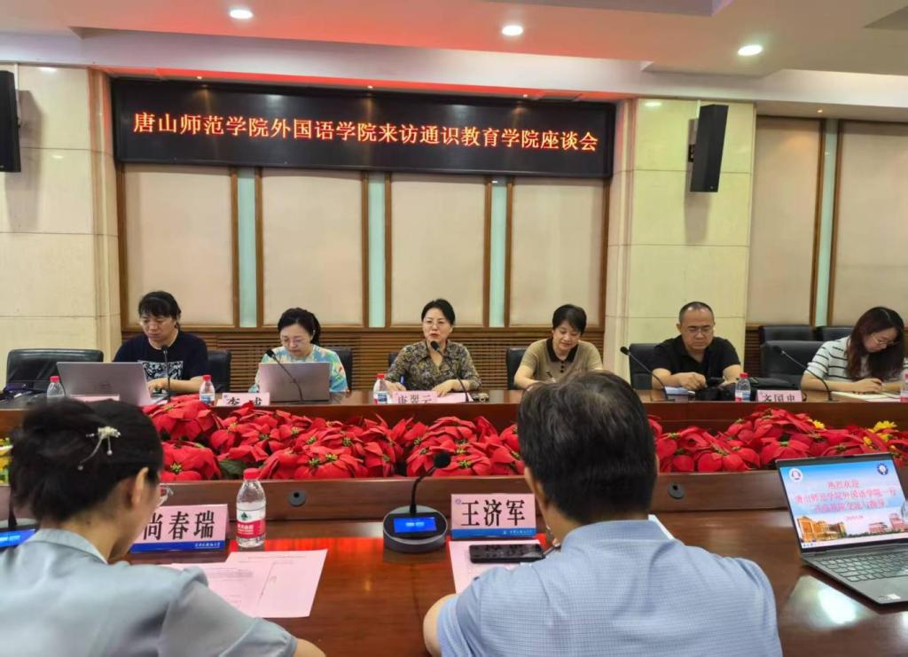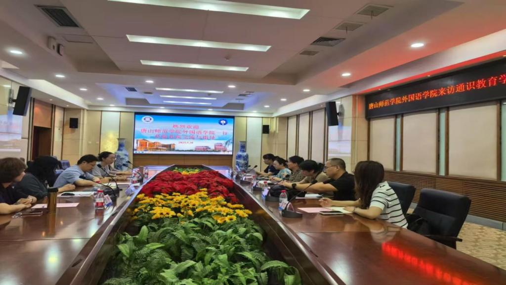 2025年5月30日上午,太阳成集团tyc122ccvip唐翠云经理带领大学英语教学团队一行六人,访问天津外国语大学通识教育公司,双方在逸夫楼莎翁厅举行了校际交流座谈会,重点围绕技术赋能教材研发、大学英语教学改革、人工智能赋能外语教学等核心议题展开深入研讨。会议由通识教育公司副经理尚春瑞主持,天津外国语大学教务处处长、通识教育公司经理王济军教授及各通识教育公司各教研室主任出席了座谈会。