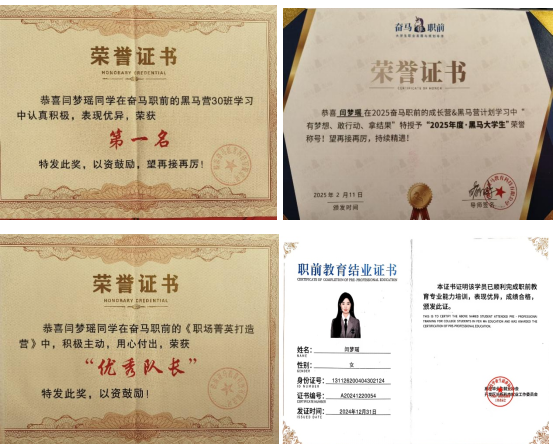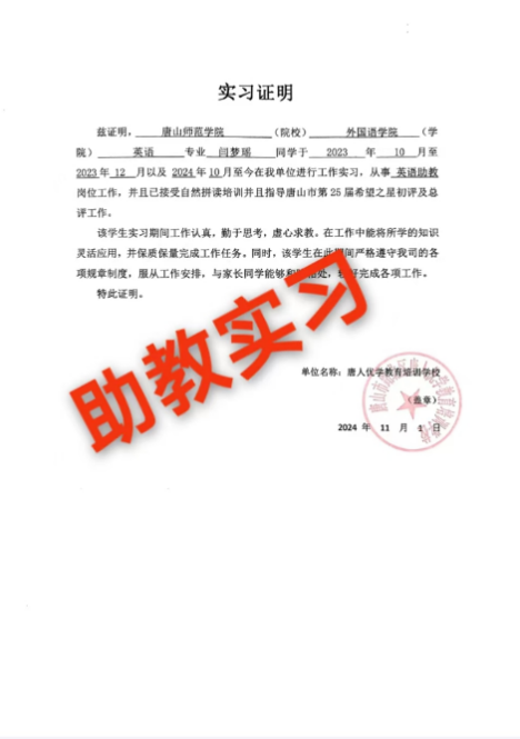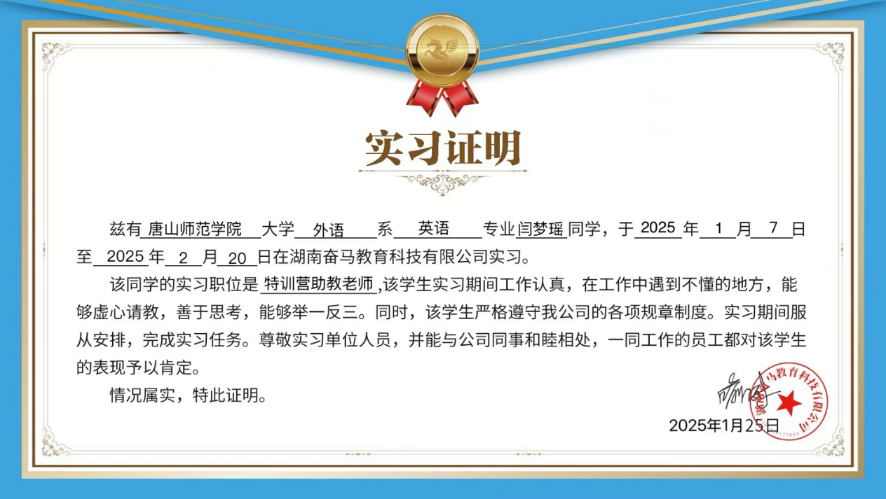 在实习实践方面,闫梦瑶积累了丰富的经验。她曾在北京小小道元、唐人优学、奋马职前教育等企业实习,在不同的岗位上发光发热。担任英语助教时,她助力青少年成长;成为督导后,她不断打磨自身职业素养,赢得了家长们的认可。在老员工职前教育领域,她以知心学姐的身份,为上百位老员工解答困惑,收获无数封感谢信。企业导师的赞誉、家长的肯定以及学弟学妹的认可,见证了她从校园学子到职场精英的华丽蜕变。