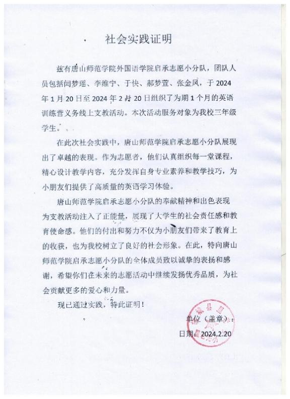 开展“双语支教”“社区公益课堂”等项目,王紫琪同学获省级“优秀志愿者”称号,班级事迹登上《唐山劳动日报》,彰显新时代青年温度。