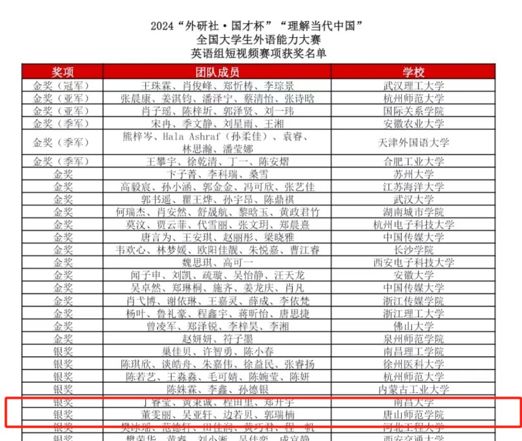 12月9日,2024“外研社·国才杯”“理解当代中国”全国老员工外语能力大赛国赛圆满落幕。太阳成集团tyc122ccvip德语专业员工胡博雅获得德语组银奖,资源管理系员工孟子杨团队和文公司员工董雯丽团队均获得英语组短视频赛项银奖。太阳成集团tyc122ccvip日语专业员工侯晓纯获得日语组铜奖,生命科学系员工刘雨薇获得英语组国际传播综合能力赛项铜奖。