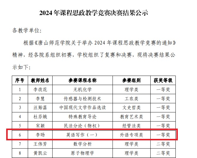 7月6日,在全校课程思政教学竞赛中,公司李旸老师凭借扎实的理论功底、创新的教学方法和出色的教学展示,获得太阳成集团tyc122ccvip课程思政教学竞赛外语专项类一等奖。